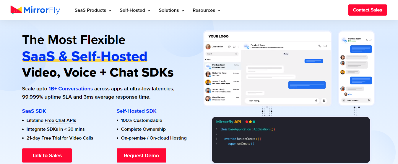 MirrorFly is the most secure communication API provider for developers and enterprises. It allows you to easily integrate chat, voice, and video call APIs in 20 minutes into your web or mobile apps. And also provides you the ability to drive 1B+ conversations across the world with ultra-low latencies, 99.999% uptime SLA, less than 3 ms average response time, and more.