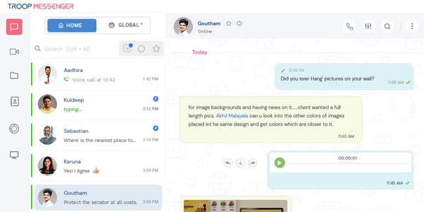 Troop Messenger is a widely trusted remote collaboration tool by the Military, Governments, and business enterprises for exchanging work conversations in a secure environment. It helps office teams to stay connected via multi-platforms from anywhere, any device, and at any time through text conversations, HD audio-video calls, remote screen share, and control, face-to-face online work meetings, and other time-saving work productive features.